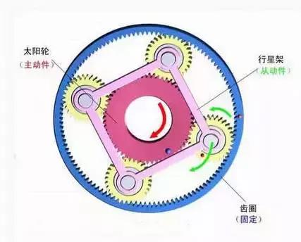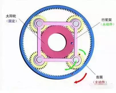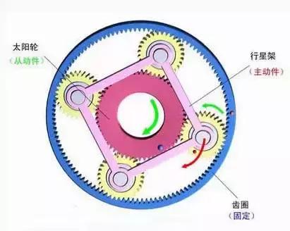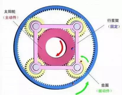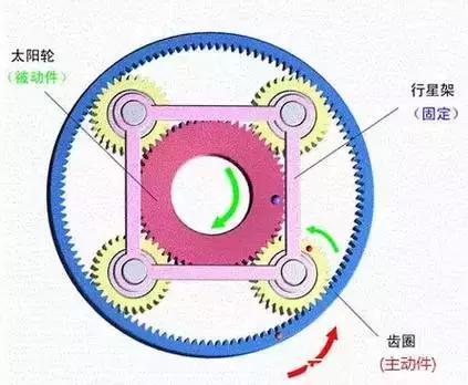 当把行星架和齿圈结合为一体作为主动件,太阳轮为被动件或者把太阳轮和行星架结合为一体作为主动件,齿圈作为被动件的运动情况。从图例1我们可以看出,行星齿轮间没有相对运动,作为一个整体运转,传动比为1,转向相同。