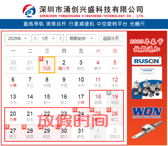 在2020年春节即将到来之际,涌创公司非常感谢您们一直以来的支持和关注,非常感谢您们对我公司代理产品WON直线导轨及