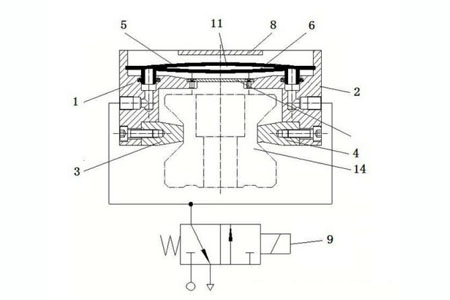 1、右座体 2、左锁紧片 3、右锁紧片 4、上弹簧钢片 5、下弹簧钢片 6、弹簧片 7、限位凸台 8 和电磁阀 9,左座体和右座体相对镜像设置,左座体和右座体上方中心设有限位凸台 8,左座体 1 和右座体 2 经弹簧片 7 固定连接,左座体 1 和右座体 2 上端中心设有弹簧钢片腔 12,下端中心设有线轨滑块移动腔 13,下端一侧与左锁紧片 3固定连接,另一侧与右锁紧片 4固定连接,左座体 1 和右座体 2 外侧壁上分别设有气体通道 10,限位凸台分别与左座体和右座体固定连接,左锁紧片 3 和右锁紧片 4 相对设置,以利于对线轨滑块进行夹紧制动,弹簧钢片腔内设有由上弹簧钢片 5 和下弹簧钢片 6 周边密封连接而形成弹簧伸缩囊 11,弹簧伸缩囊 11 一端与左座体 1 固定连接,另一端与右座体 2 固定连接,上端与限位凸台 8 相抵触,下端与弹簧片 7 相抵触,弹簧伸缩囊 11 上设有压缩空气出入口,气体通道 10 一端与压缩空气出入口相连通,另一端与气源相连通,以使弹簧伸缩囊 11内填充有压力气体,气体通道 10上设有电磁阀 9,以利于通过电磁阀 9自动控制弹簧伸缩囊 11 内的气体含量,使弹簧伸缩囊 11 带动左座体 1 和右座体 2 相对移动或相背移动,进而实现自动调整左锁紧片 3 和右锁紧片 4 对线轨滑块进行自动夹紧制动的作用。