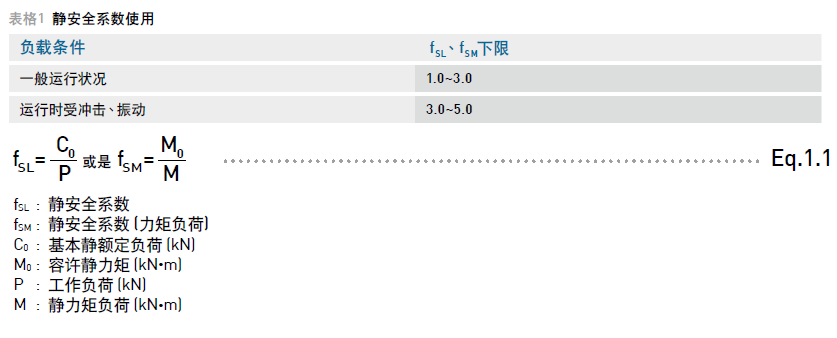 当直线导轨使用在慢速运动或作动频率不高的状况下,需考虑静安全系数。根据不同的使用状况,计算静负荷必