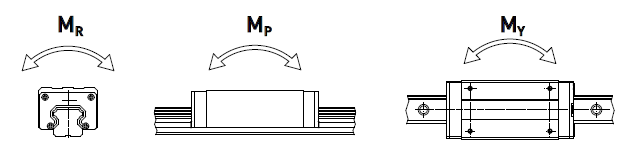 当滑块中受到最大应力的钢珠达到上述定义之静额定负荷时,此时滑块所承载之力矩称为静额定力矩。在直线导轨运动中是以MR、MP、MY这三个方向来定义: