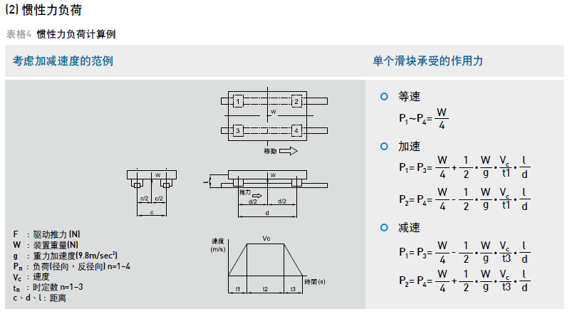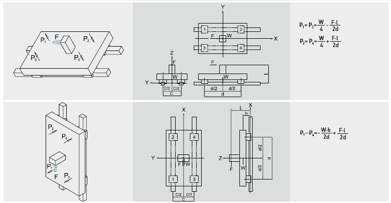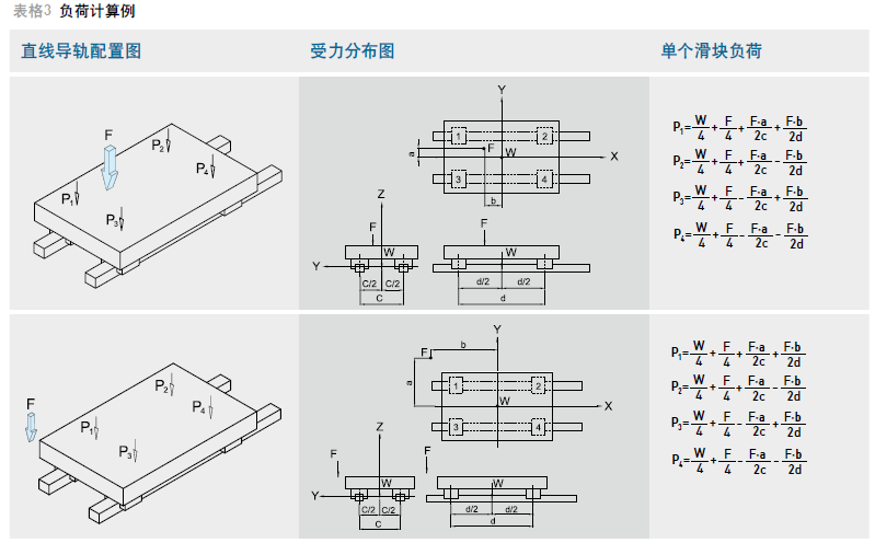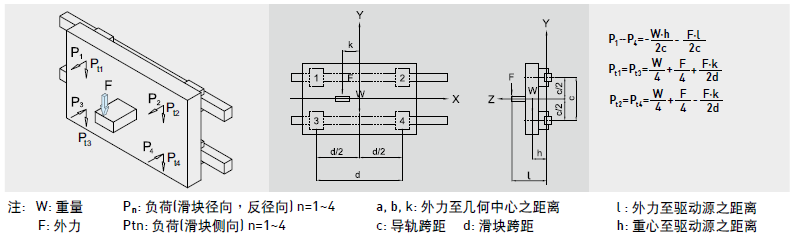 工作负荷的计算方式会随实际受力分布的情形而产生变化,例如承载物体本身重心的位置、施力的位置,以及运行时起动、停止的加速度惯性力等皆对负荷的计算发生影响,因此使用直线导轨时必须仔细考虑各种负荷状况,以计算出最正确的负荷值。