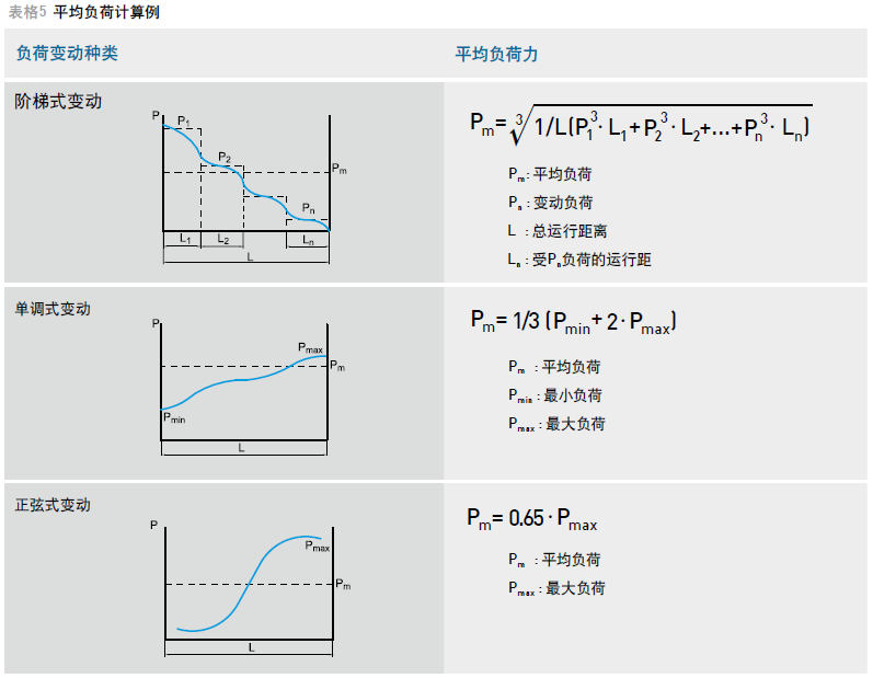 在运行中滑块承受的负荷有时并不是均等的,比方搬送装置的运行,其前进时额外承受货物的重量,退回时则只承受装置本身的重量,负荷呈现阶梯式变化,因此必须求出运行中的平均负荷以计算寿命。平均负荷的定义是与负荷变动条件下寿命相等的等效负荷值。