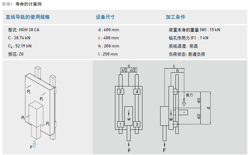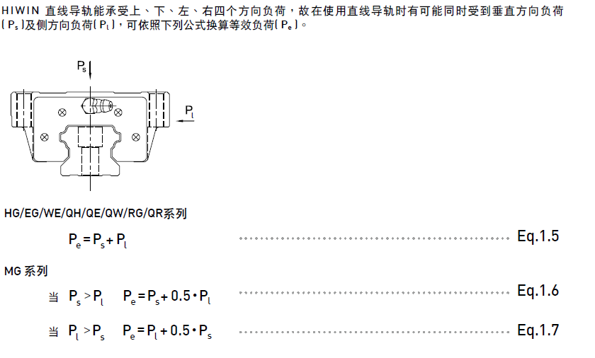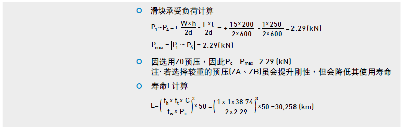 根据经验选用直线导轨的型式、规格,再依实际使用情况估算单个滑块最大工作负荷,计算动额定负荷与工作负荷之负荷比推算出其使用寿命。