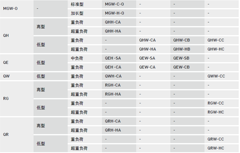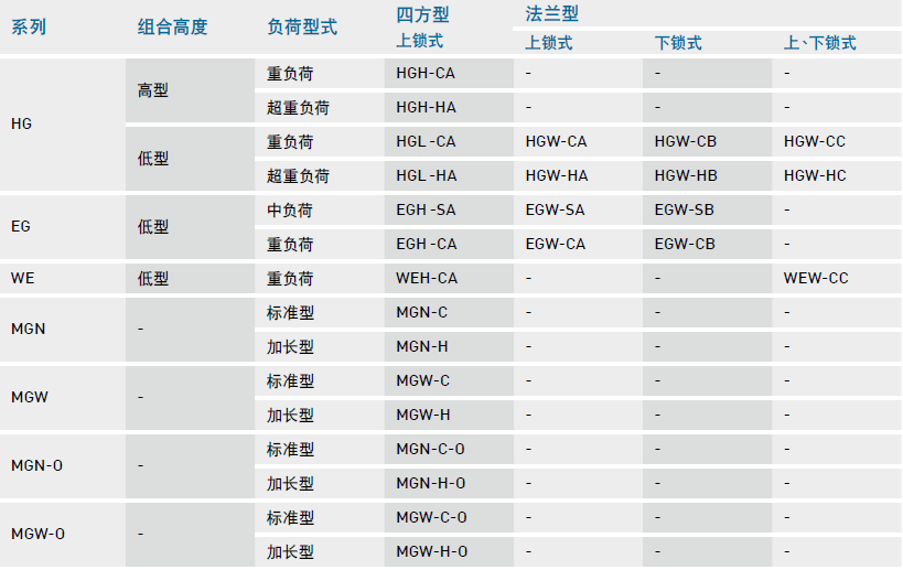 为服务客户因应其对产品多样性的需求,除了适用一般工具机产业的HG系列外,更研究开发出较适合自动化产业的EG系列以及适合于单轴设备使用的WE/QW系列;且研究开发出适合高刚性需求产业的RG/QR系列及微小型机械半导体产业适用之MGN/MGW系列;并针对高科技产业研究开发出具有高速、宁静、低发尘需求的QH/QE系列产品。