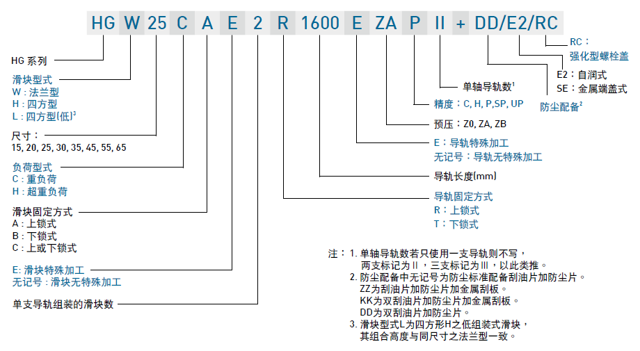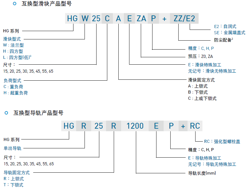 HG系列分为非互换性及互换性型两种直线导轨,两者规格尺寸相同,主要差异点在于互换性型之滑块、导轨可单出互换使用,较便利,但其组合精度无法达到非互换性型之超高精度,不过由于HIWIN在制造上有良好的尺寸控制及严格的质量要求,互换性型之组合精度目前已达到一定的水平,对不需配对安装直线导轨的客户而言是一项很好的选择。直线导轨的产品规格型号主要标明直线导轨尺寸、型式、精度等级、预压等规格要求,以利订货时双方对产品的确认。