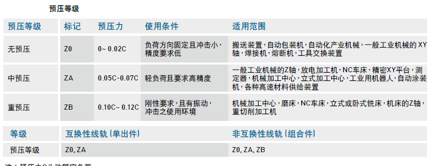 A、无预压:标示为Z0;预压力为 0~ 0.02C ;使用条件:负荷方向固定且冲击小,精度要求低;适合范围:搬送装置,自动包装机,自动化产业机械,一般工业机械的 XY轴,焊接机,熔断机,工具交换装置