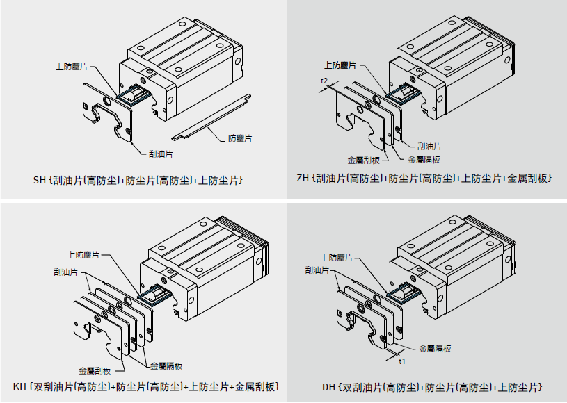 HIWIN针对较一般环境严苛之作业环境,开发强化高防尘功能之防尘配件,若有下列高防尘配件需求时,请于产品型号后面加注代码。