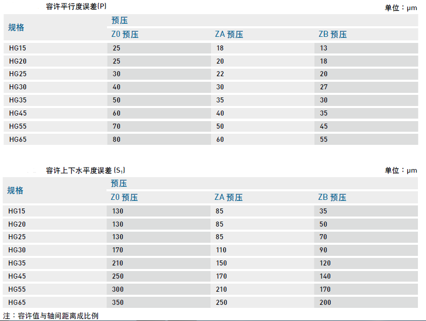 HG系列为圆弧两点接触式直线导轨,其自动调心的特性可以吸收安装面的些许误差而不影响直线运动的顺畅性;下表中注明了安装平面的容许误差值: