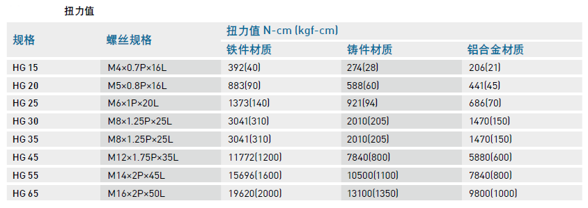 安装导轨时是否锁紧贴平基准面影响直线导轨精度甚剧,因此为达到每颗螺丝都能锁紧的目的,建议使用下列扭力值锁装配螺丝。