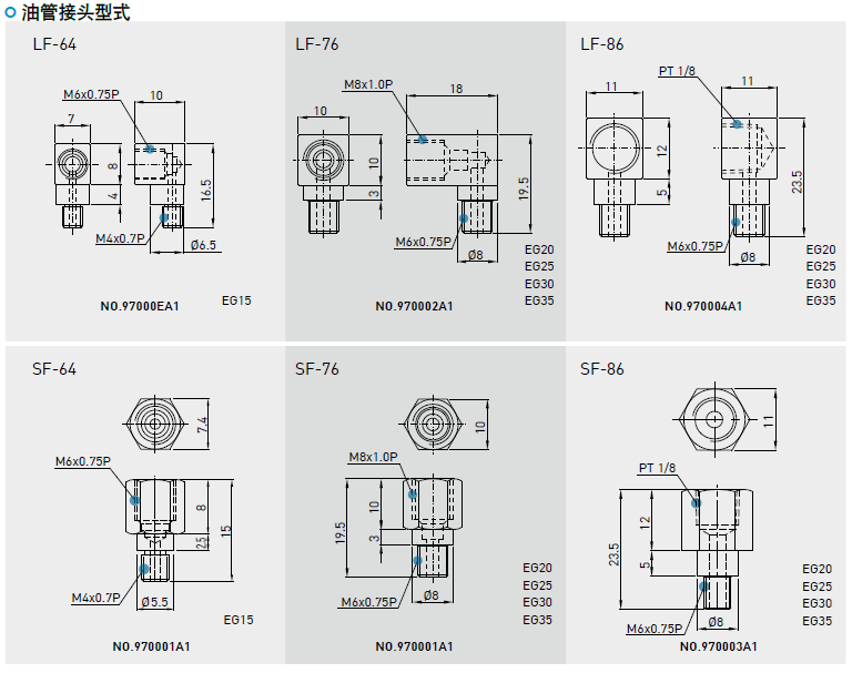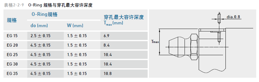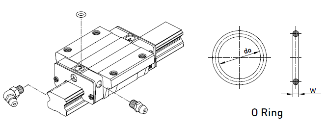 依客户需要在滑块前端或后端装上油嘴以供手动打油,EG系列特别在端盖侧边预留侧油孔位置安装油嘴(一般为直油嘴),提供侧向打油,侧向打油的位置建议在非侧基准边,但若有特殊需要亦可放在侧基准边。客户如有上述侧向打油需求请与我们联络。EG系列在端盖顶端亦预留上油孔位置,客户若欲从端盖上方供油,须使用直径0.8mm的金属针以预热的方式,在指定位置将上油孔穿通,再将密封环安装于凹处即可,避免使用钻头穿通上油孔,碎屑有污染油道的危险。使用接管方式自动供润滑油脂之直线导轨,则可依连接管型式选用安装油管接头。