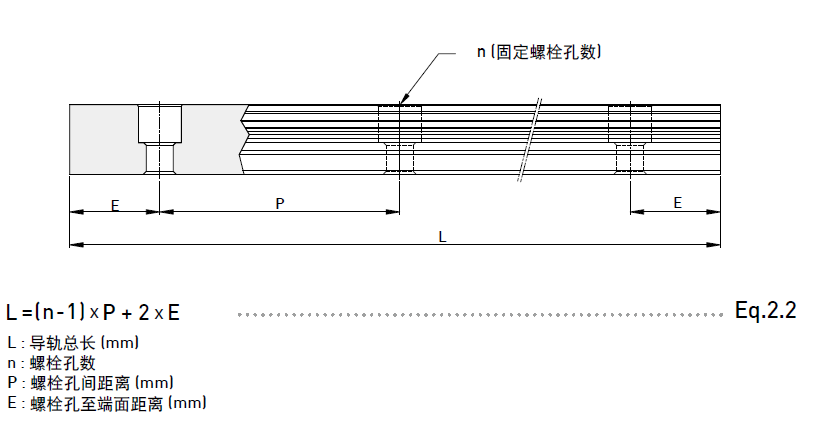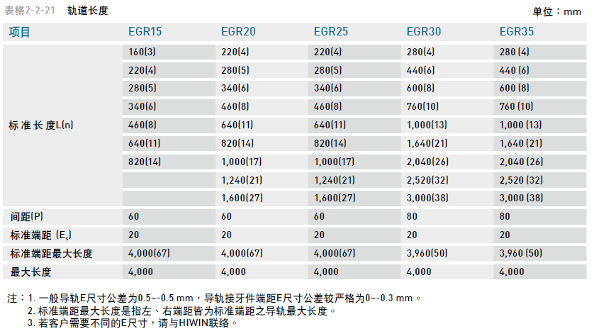 HIWIN 备有导轨标准长度库存供应客户需求。若客户订购非标准长度导轨时,端面距离E的尺寸最好不要大于1/2P,防止因E的尺寸过大导致导轨装配后端部的不稳定,而降低直线导轨的精度。