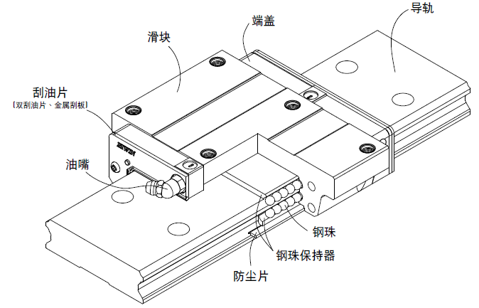 滚动循环系统:滑块、导轨、端盖、钢珠、钢珠保持器。