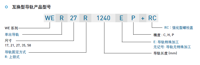 WE系列分为非互换性及互换性型两种直线导轨,两者规格尺寸相同,主要差异点在于互换性型之滑块、导轨可单独互换使用,较便利,但其组合精度无法达到非互换性型之超精密级以上的精度,不过由于HIWIN互换性型之组合精度目前已达到一定的水平,对不需配对安装直线导轨的客户而言,是一项便利的选择。直线导轨的产品规格型号主要标明直线导轨尺寸、型式、精度等级、预压等规格要求,以利订货时双方对产品的确认。