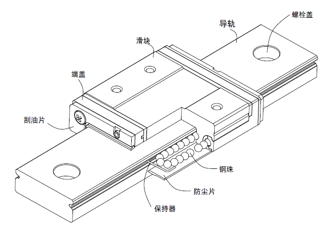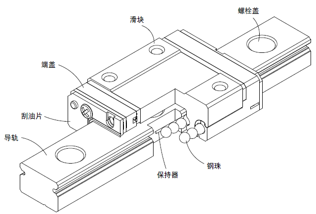 滚动循环系统:滑块、导轨、端盖、钢珠、保持器