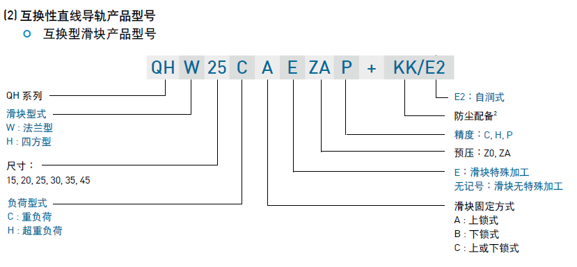 QH系列分为非互换性及互换性两种直线导轨,两者规格尺寸相同,主要差异点在于互换性型之滑块、导轨可单出互换使用,较便利,但其组合精度无法达到非互换型所拥有的超高精度等级。不过由于HIWIN在制造上有良好的尺寸控制及严格的质量要求,互换性型之组合精度已达到一定的水平,对不需配对安装直线导轨的客户而言,是一项很好的选择。