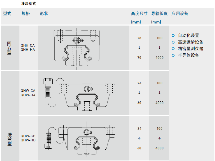 HIWIN提供法兰型及四方型两种直线导轨,它主要用于以下设备当中。当然,其它机器设备都可以用到,但其成本过高,好多人选择了普通的使用!