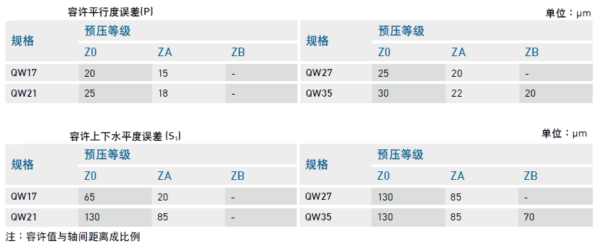 2、安装平面误差,直线导轨QW系列为圆弧两点接触式直线导轨,其自动调心的特性可以吸收安装面的些许误差而不影响直线运动的顺畅性;下表中注明了安装平面的容许误差值: