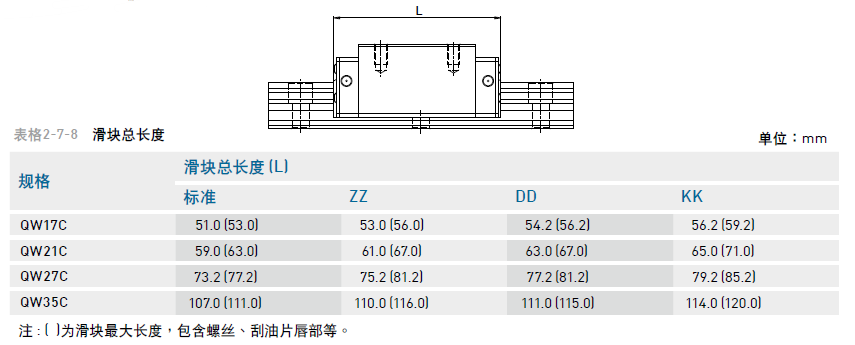 3、 防尘代码之滑块总长度及规格对照表,请订直线导轨的时候一定要确认清林,以便出错