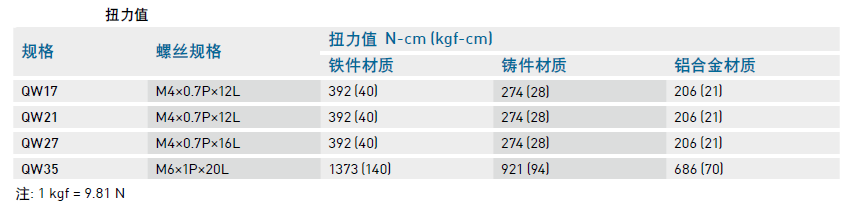 直线导轨精度甚剧,因此为达到每颗螺丝都能锁紧的目的,建议使用下列扭力值锁装配螺丝。