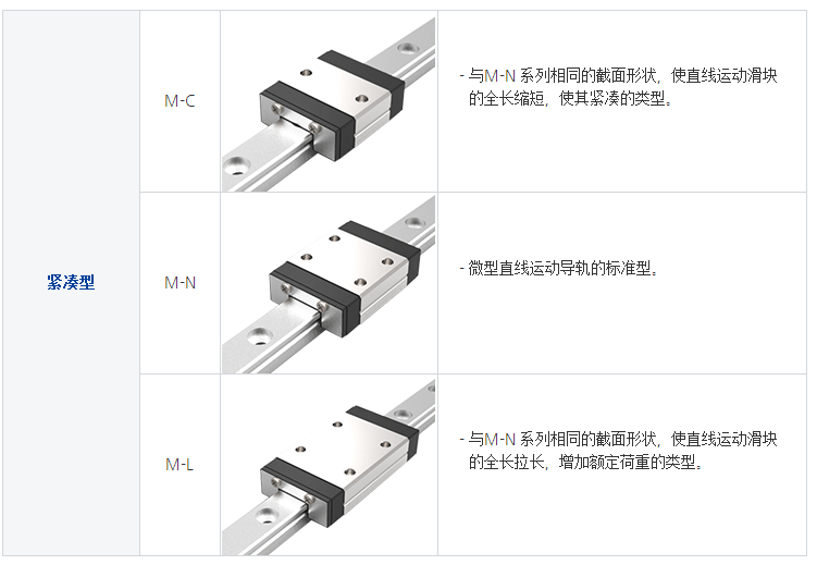 体积小、轻量化,滑块主体的一部分采用了树脂材料,重量减少约20%,特别适合小型化设备使用。不锈钢材质之线性滑轨,包含滑块、滑轨及其它金属配件如钢珠、保持器等,皆使用不锈钢材质,具备防锈的特性。采用哥德型四点接触设计,可承受各方向负荷,具备刚性强,精度高等特性。有钢珠保持器设计,在精度允许下具备互换性。