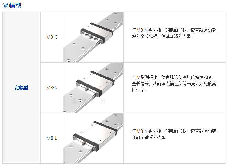 加宽滑轨之设计大幅提升力矩负荷能力,可单轴使用。模块化回流系统设计,采用树脂材料,重量减少约20%。哥德型四点接触设计,可承受各种方向之负荷并具有高刚性之特点。滑块装有微小型保持钢丝,取下滑块钢珠也不会脱落。