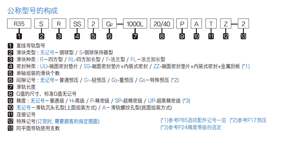 间隙记号 : 无记号-普通预压 / G1-轻预压 / G2-重预压 / GS-特殊预压 (*2)